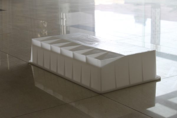 一款類似梯形結構的公路側石模具,采用具備高度韌性的聚丙烯塑料為原料,經大型專業注塑設備加工完成。結構上同樣采用其他類似路側石模具的設計方案,在塑料模具底部及四周布滿加強筋,合理的提升此公路側石模具的耐用性。