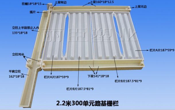 3.最后采用PP塑料的高鐵防護柵欄欄片模具,一樣有4個組成部分,尺寸分別為: