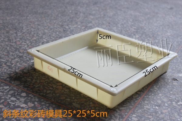 在這款步道磚塑料模盒在外觀設計上,通過改變形狀,花樣等,讓塑料彩磚模具制品在后期澆筑過程中能更好的使用。條紋的設計上改變以往橫向條紋的使用,以斜條紋樣式為彩磚模盒內部的主要形狀,斜條紋的設計可以增大彩磚與行人與地面之間的接觸面積,即便是在下雨天出行時也不會打滑等現象,且還能美觀使用場所的環境,常用于城市、公園、社區等步行道上。