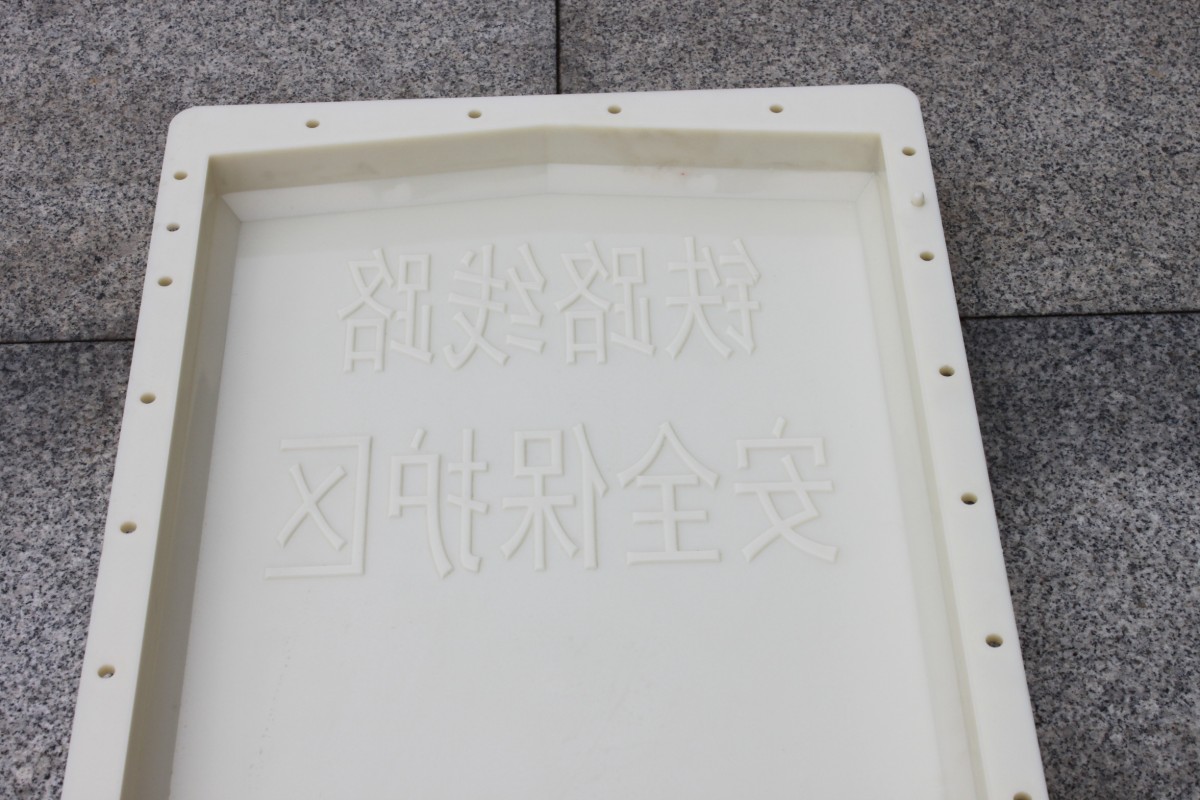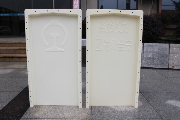 水泥警示牌模具使用ABS材質注塑工藝制造,主要分為2個部分。正面為標有“鐵路線路安全保護區”字樣,反面為一個中國鐵路圖案,配件方面主要為2個主體部分組裝時所需要的螺絲螺帽。主要應用為水泥混凝土警示牌預制,主要功能是在中國鐵路建設中,提醒人們為此處為鐵路線路安全保護區,在施工等一系列活動中需注意國家鐵路的安全。