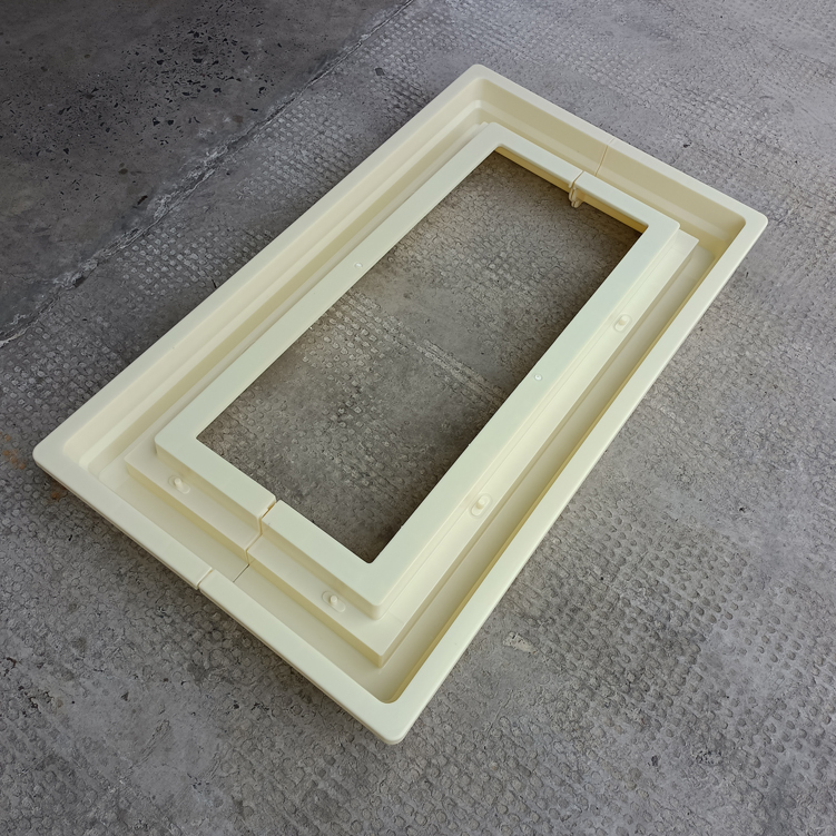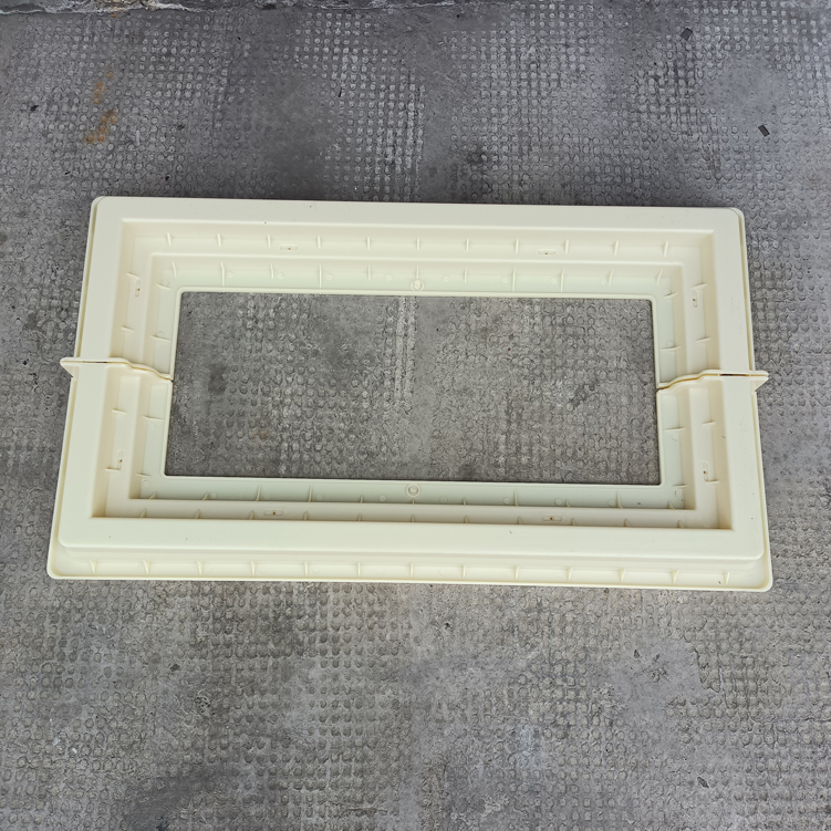 方井座塑料模具,模具采用拼接方式、為兩個(gè)組裝而成、寬度可以增加調(diào)節(jié),有設(shè)配件井座B,該長(zhǎng)度、寬度尺寸為模具尺寸最外邊、包括翻邊。